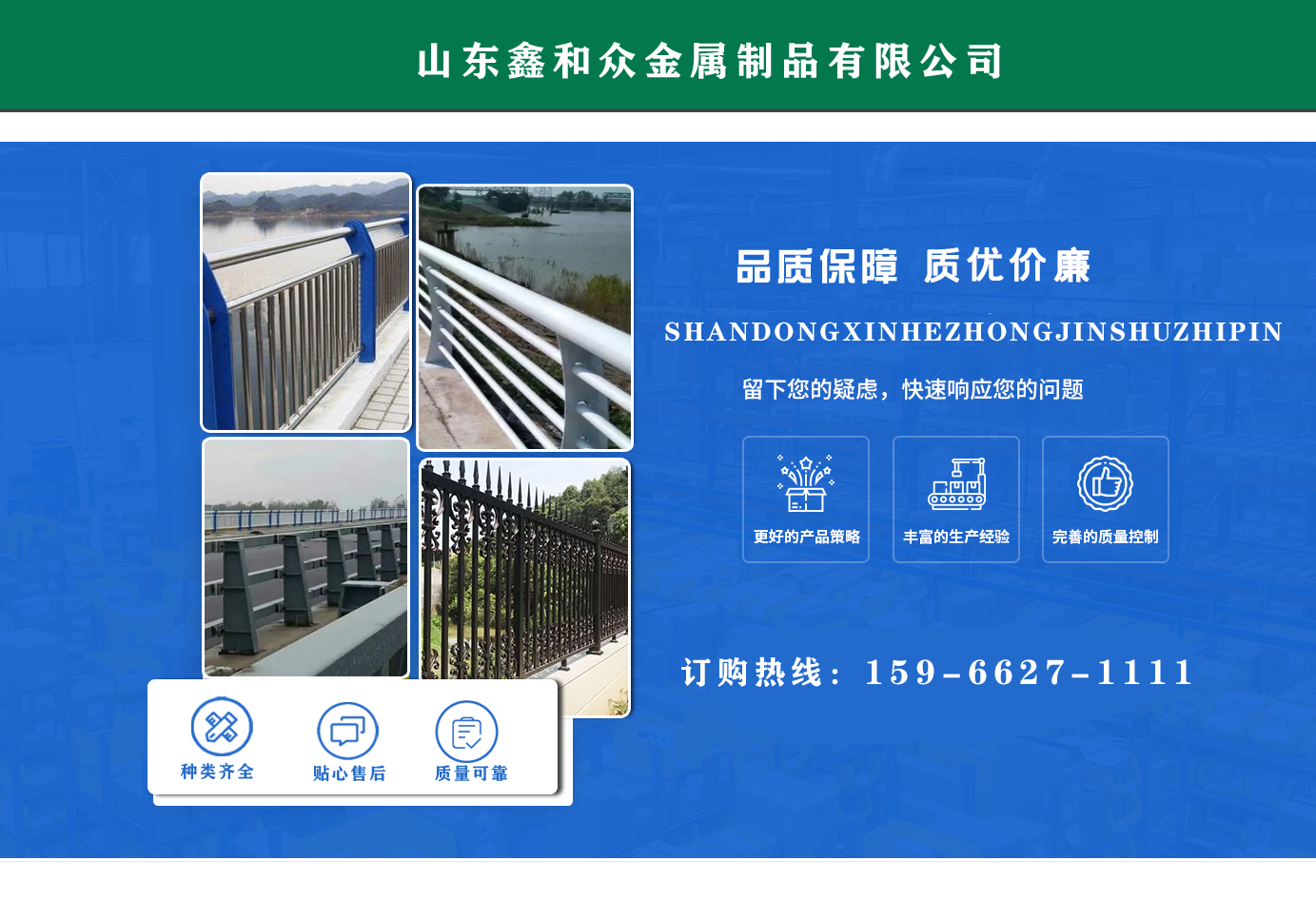 山東鑫和眾金屬制品有限公司主要產品有防撞護欄,橋梁護欄,道路護欄,河道護欄,不銹鋼護欄等護欄。提供設計方案,一站式定制,包您滿意價格優(yōu)惠,歡迎來電咨詢! 公司常年從事銷售護欄防撞護欄,橋梁護欄,道路護欄,河道護欄,不銹鋼護欄,橋梁鋼護欄,河道燈光護欄等。產品廣泛應用于橋梁、河道、旅游景區(qū)、道路、公路、公園、小區(qū)、景觀、道路防撞等領域。 公司產品均采用優(yōu)質不銹鋼材料,符合相關標準。各種型號不銹鋼復合管及護欄,質量嚴格把控。產品強度高、耐腐蝕、焊接牢固、抗沖擊、性能好,防撞護欄結構簡單、美觀實用大方?! g迎前來訂購!...